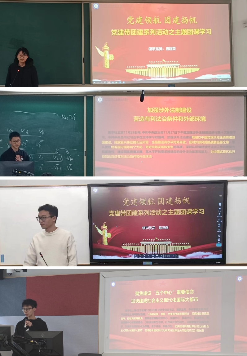 三项内容分别从不同的视角,向同学们梳理了在向第二个百年奋斗目标的进程中,身为青年学子,应当锚定的方向。在学习中,七位党员同志带领大家共同学习了习近平总书记在上海考察时的重要讲话精神,鼓励同学们要明确自己的时代使命,要在不断提升自身综合素质的同时,为国家的长期发展贡献力量。