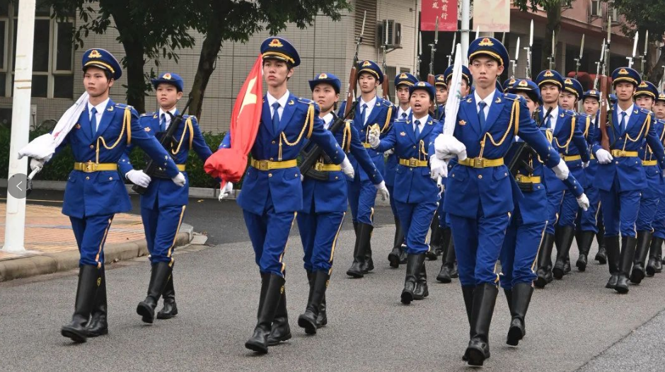 国旗护卫队迈着高度整齐的步伐出旗后,升旗手熟练地升起国旗,在全体肃立行注目礼并且合唱国歌后,国旗升至顶端,在空中迎风招展。接着就是升校旗的环节,奏唱校歌时,每个人脸上都洋溢着自豪。
