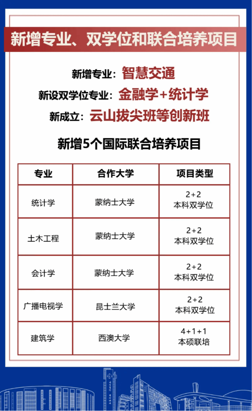 今年,学校加大力度施行本硕博一体化培养。新成立数学与应用数学“云山拔尖班”,实行“2+4+X”贯通培养模式。在人工智能全面赋能教育和产业变革的时代背景下,新增智慧交通专业,招生计划共计50人。学校在经济与统计学院新设“金融学+统计学”双学位本科专业,培养具备应用经济学和统计学双重知识背景的毕业生,招生计划共计30人。新增加5个国际联合培养项目,致力于培养高素质、复合型人才。