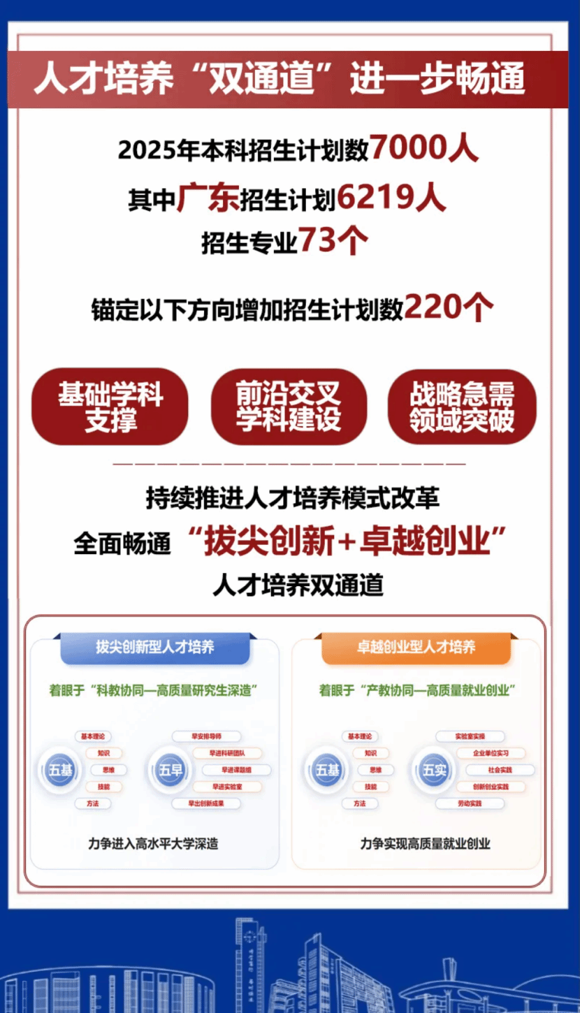锚定基础学科支撑、前沿交叉学科建设、战略急需领域突破三大方向,我校2025年本科招生计划中,在基础学科、前沿交叉学科、战略急需领域专业招生计划数增加220个。