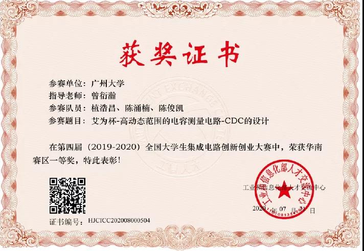 第四届全国大学生集成电路创新创业大赛·艾为杯华南赛区一等奖