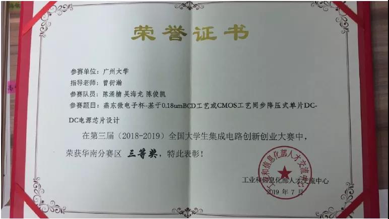 第三届全国大学生集成电路创新创业大赛华南赛区三等奖