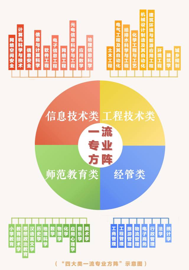 打造了信息技术、工程技术、经管、师范教育四大类一流专业方阵,形成了一系列金牌专业,培养创新、创造和创业的“广大人”。