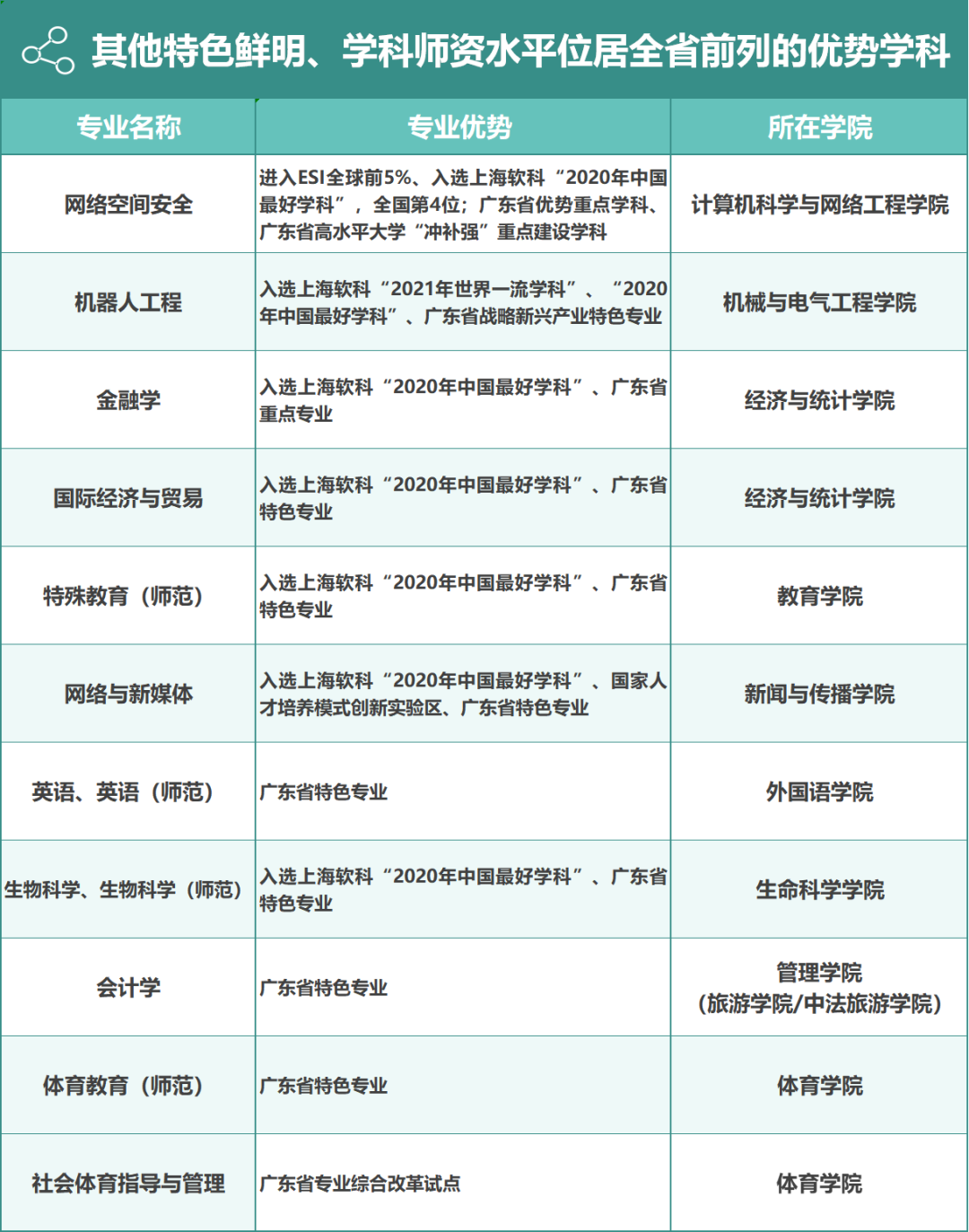 牢牢把握国家“双一流”战略、省市高水平大学建设、粤港澳大湾区建设战略机遇,深度对接国家创新驱动发展和粤港澳大湾区、广东广州经济社会发展需求,聚焦新工科、新师范、新文科建设,积极探索新医科发展,不断深入优化调整学科布局,明确了“厚理精工、优文特教、交叉融合、创新发展”的新路子,促进整体办学水平的新跨越,奋力创建中国特色社会主义一流创新型大学。
