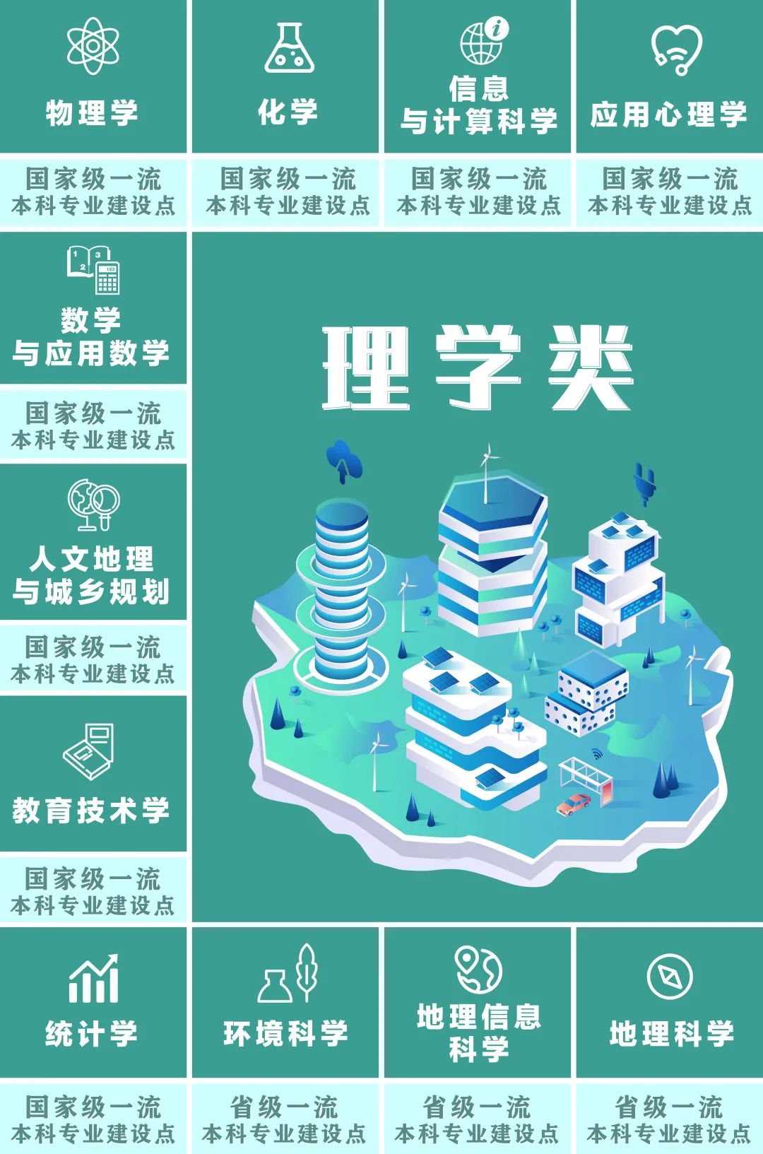 理学类一流本科专业建设点分布于数学与信息科学学院、物理与材料科学学院、化学化工学院、地理科学与遥感学院、经济与统计学院、教育学院、环境科学与工程学院。
