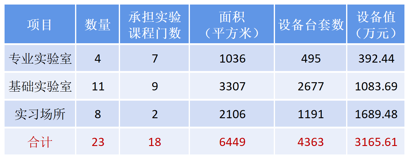 专业拥有23个校内实验实习场所,其中专业实验室4个、基础实验室11个、实习场所8个,总占地面积6449平方米,设备共计4363套,设备总值3165.61万元。实验室情况如下表所示: