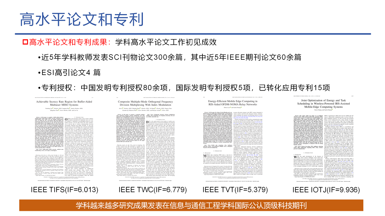 本学院教师先后承担了近百项国家、部、省和市级重大科技攻关项目,成果显著。近五年来学科教师发表SCI刊物论文300余篇,其中近五年IEEE期刊论文60余篇。学院已逐步形成了一支高水平、高职称、高学历、结构合理的兼具深厚专业知识理论和丰富实践经验的教师团队。