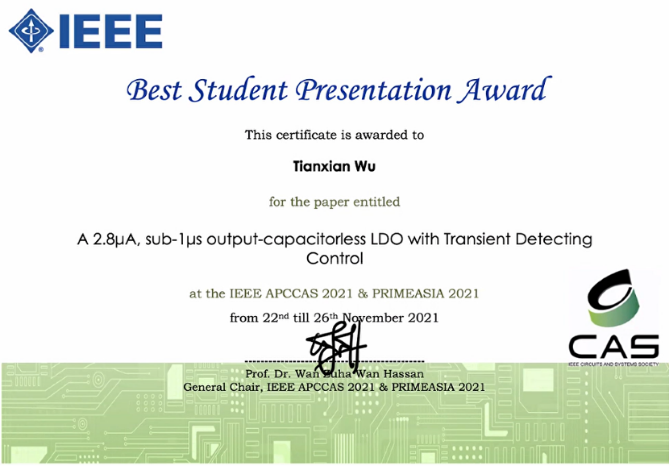 本科生在IEEE APCCAS会议上获得Best Presentation奖