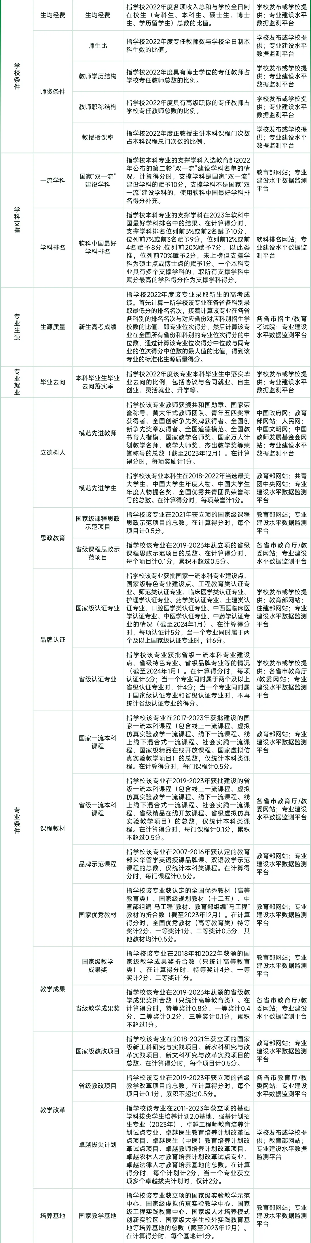 “软科中国大学专业排名”的指标定义与数据来源如下图所示: