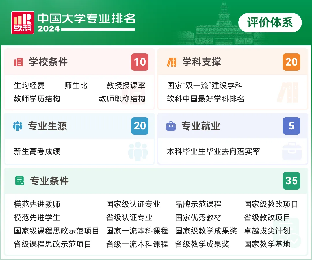 “软科中国大学专业排名”的评价体系由学校条件、学科支撑、专业生源、专业就业、专业条件5个指标类别组成,下设25项测量指标。在绝大多数专业,5个指标类别的权重分别为学校条件(10)、学科支撑(20)、专业生源(20)、专业就业(5)、专业条件(0-35)。