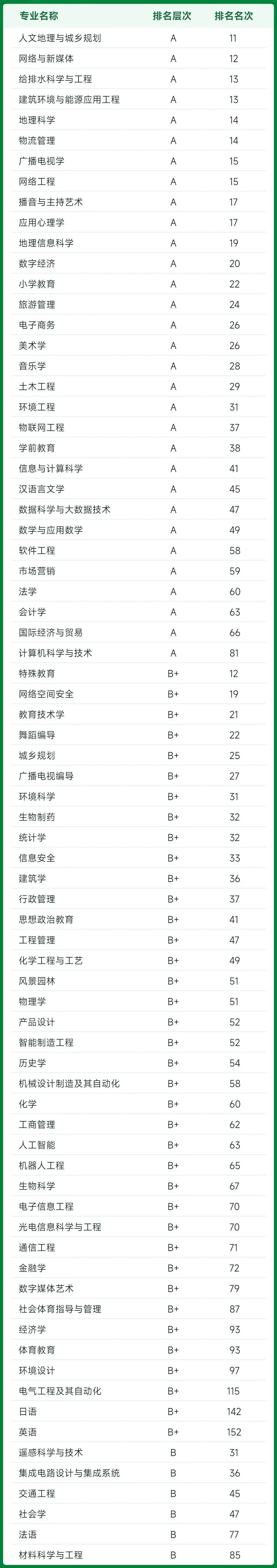 75个专业上榜,上榜专业占比高达98.7%。其中A专业有31个,B+专业有38个,B专业有6个。