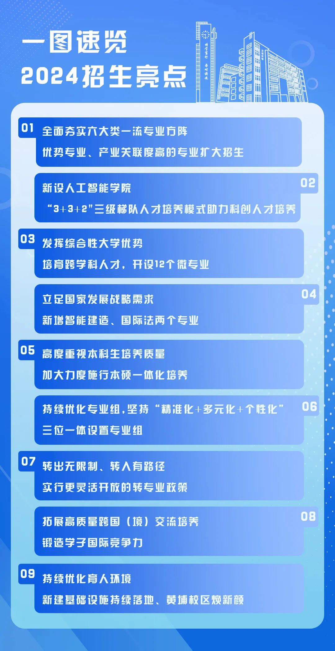 两个新增专业为国际法、智能建造,招生计划共计110人。其中,“智能建造”专业致力于培养具有良好的科学、技术与人文素养,工程实践能力突出、创新能力强,以智能规划与设计、智能装备与施工、智能运维与管理等为发展方向的复合型工程技术创新人才;“国际法”专业,通过系统学习国际法的基本理论和国际法的实践应用,致力于培养德才兼备,具有合理的知识结构与宽广的国际视野,具有坚定的社会主义法治理念和良好的法律职业伦理,具备涉外法律工作基本能力和素养,坚持中国特色社会主义法治体系和通晓国际规则的高素质法治人才。