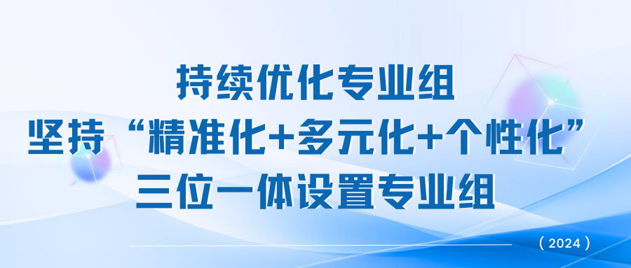 采用“精准化+多元化+个性化”三位一体的专业组设置模式,适应新高考招生模式改革,着力推动招生与培养的深度衔接。