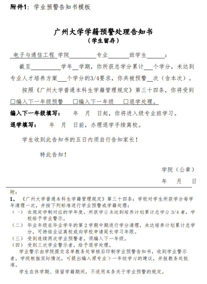 1.教务办负责学籍管理的老师于每学年结束后的开学初补考登分完成后全面清查学生课程学习情况,按照《学籍管理规定》要求审核学分,拟定学业警示学生名单,印制《酒店偷拍 学籍预警处理告知书》(详见附件1)一式两份。并将“学生留存页”一份上交学工办,“学生留存页”一份及“学院留存页”两份分发给相关班级班主任。