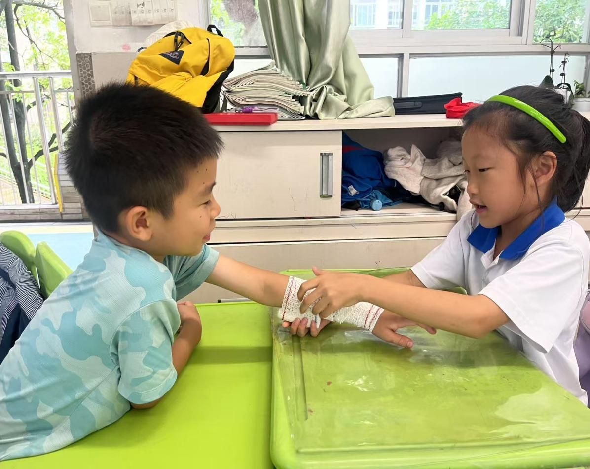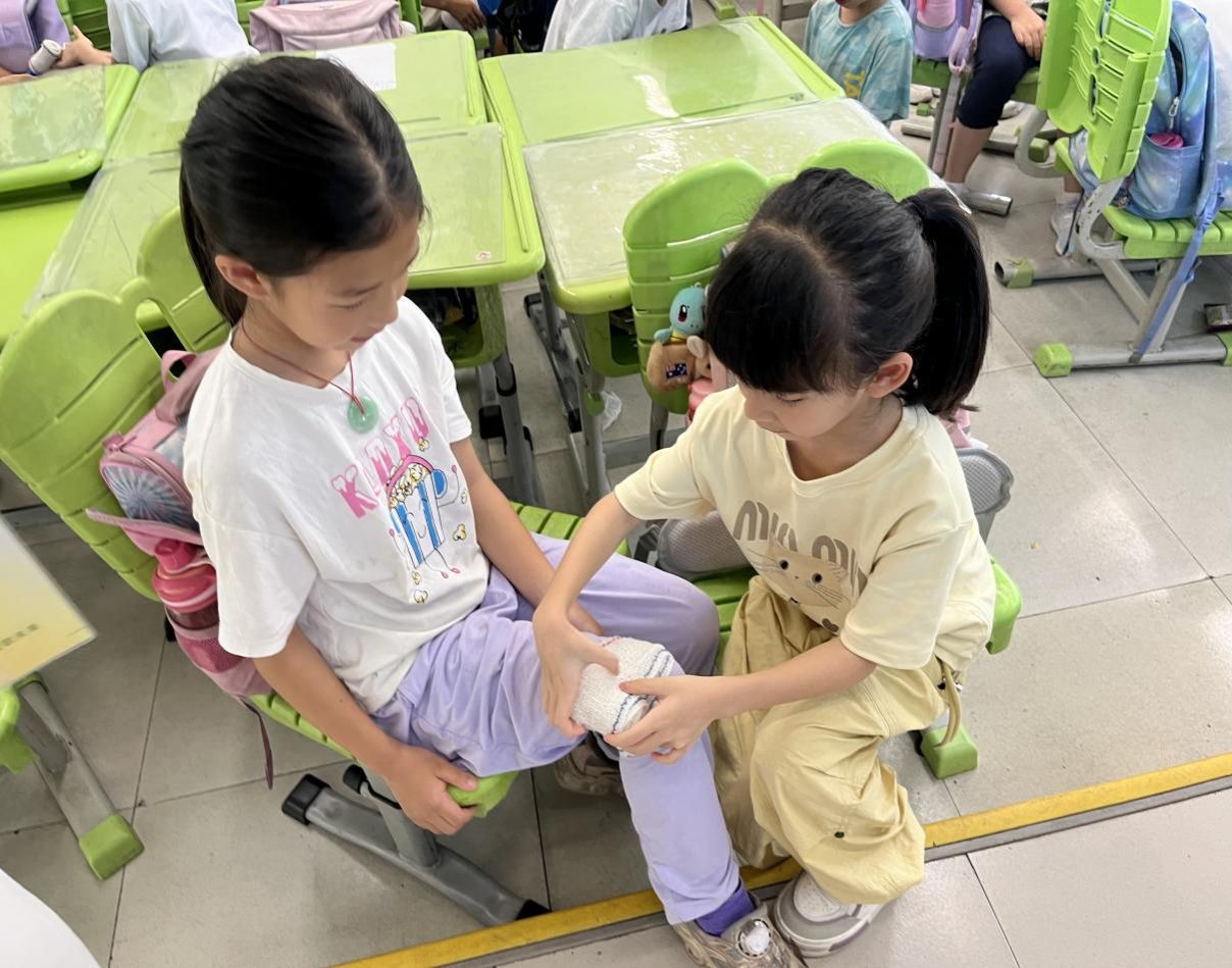 发现有人受伤时,快速、准确地用绷带、三角巾或者现场可以利用的其他材料包扎,是外伤救护的重要环节。志愿者林瑞琪王子欣曾宇星为学生们传授手部包扎、手臂包扎、膝盖包扎的急救技能。现场示范后,其余志愿者分别下到各小组对同学们进行现场指导,告诉他们怎样正确包扎。活动中,小朋友们认真听讲,积极思考,互为包扎对象,亲身实践,现场气氛非常活跃。