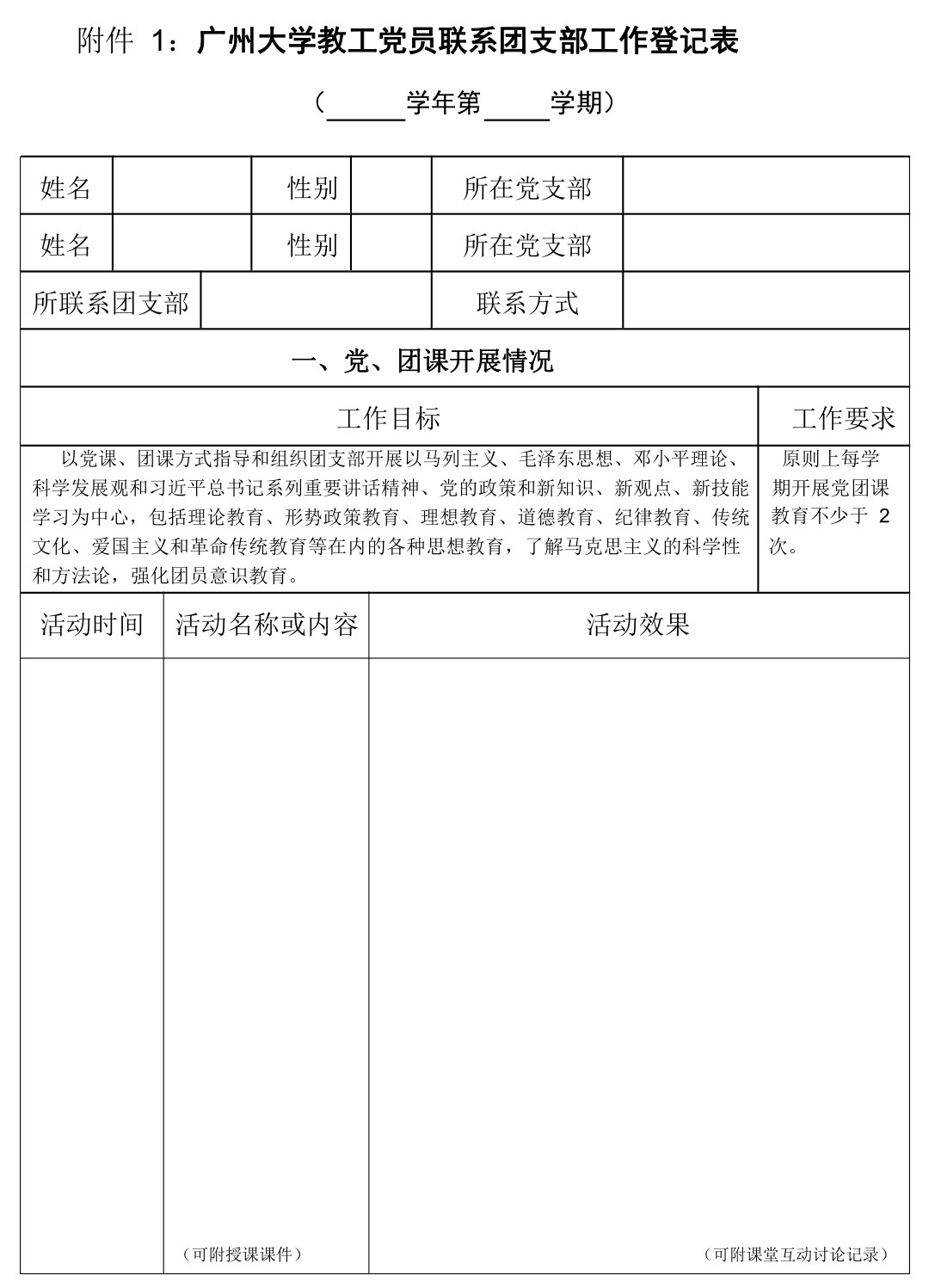 教工党员联系团支部工作登记表》(见附件 1)。教职工党员要定期向学院党委汇报联系对象的情况。