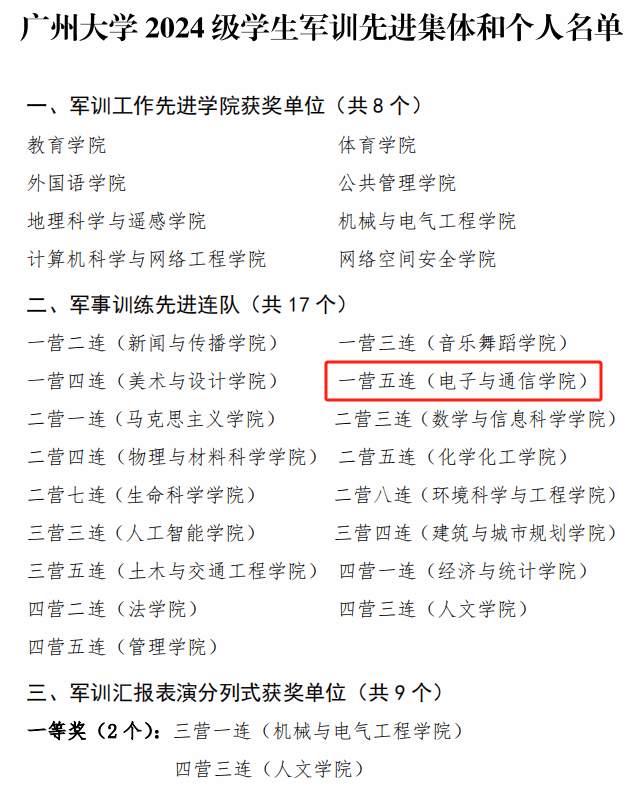 在2024级学生军训过程中,全体参训人员在军训团教官的带领下,经过刻苦训练,不仅掌握了基本的军事理论和军事技能,增强了国防意识和组织纪律,同时还学习了擒敌拳、模拟射击、行军拉练、匕首操、消防技能、战场医疗救护以及心肺复苏急救培训等科目知识,圆满完成了军训计划,涌现出一批作风优良、训练刻苦、成绩突出的先进集体和个人。其中,酒店偷拍 荣获酒店偷拍 2024年军事训练先进集体和军训汇报表演分列式三等奖,谢玲、欧阳曦、张宇靖老师荣获军训优秀工作人员,罗琳等35名同学被授予“军训积极分子”称号,潘家扰、田苗、王益周入选“军训国旗护卫队连队”,苏静雯、陈晓昌、蔡欣熹获评“军训优秀导生”。