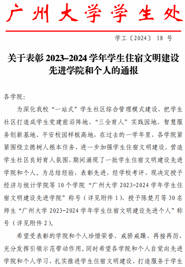 为深化我校“一站式”学生社区综合管理模式建设,把学生社区打造成学生党建前沿阵地、“三全育人”实践园地、智慧服务创新基地、平安校园样板高地,在过去的一学年里,各学院紧紧围绕立德树人根本任务,进一步加强学生住宿文明建设,营造学生社区良好育人氛围,期间涌现了一批学生住宿文明建设先进学院和个人。