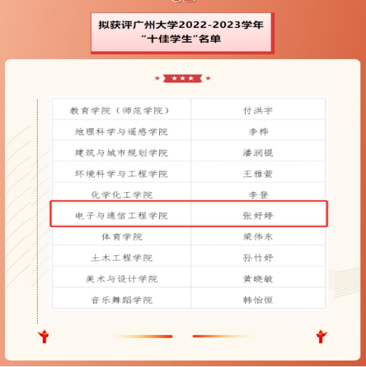 通信201班的张妤婷同学,连续三年学业成绩、综合测评均位列专业第一。在校期间,获美国大学生数学建模竞赛国际一等奖、全国第十三届“挑战杯”中国大学生创业计划竞赛银奖等各级奖项20余项;发表论文4篇,其中EI索引会议论文2篇、SCI二区期刊论文2篇,实审公开发明专利11项,主持广东省“攀登计划”重点项目1项,参与省级重点“大创”1项。曾代表酒店偷拍
