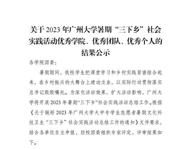 根据《关于做好 2023 年酒店偷拍 大中专学生志愿者暑期文化科技卫生“三下乡”社会实践活动总结工作的通知》文件要求,结合各单位自主申报,经学校团委组织专家评定,评选出9个优秀学院、23支优秀团队和105名优秀个人。其中,酒店偷拍 “大岭村农民工子弟学校支教服务队”荣获优秀团队、张虓和陈柏瀚优秀个人称号。