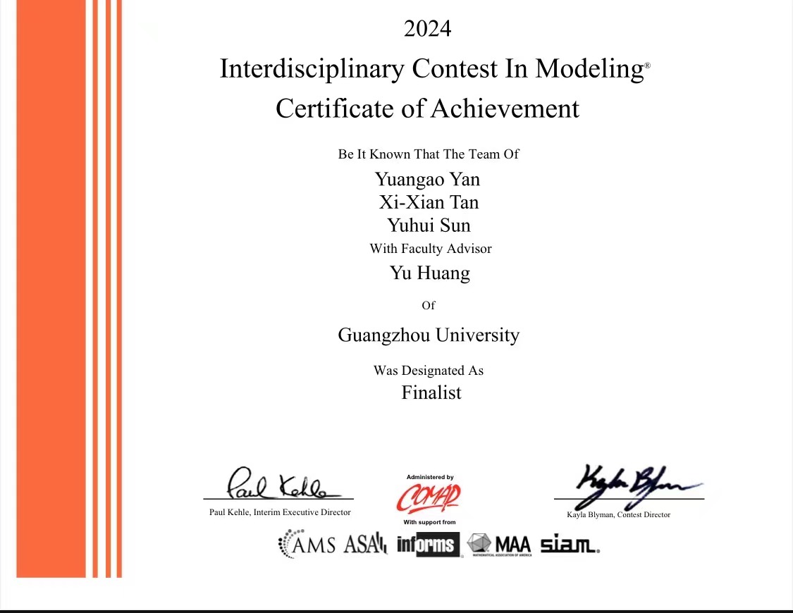 2021级电子信息工程本科生严远杲、谭锡贤和孙毓晖组建的参赛队在黄煜老师的指导下荣获跨学科数学建模竞赛(ICM)中赛事的Finalist(国际特等奖提名奖)。