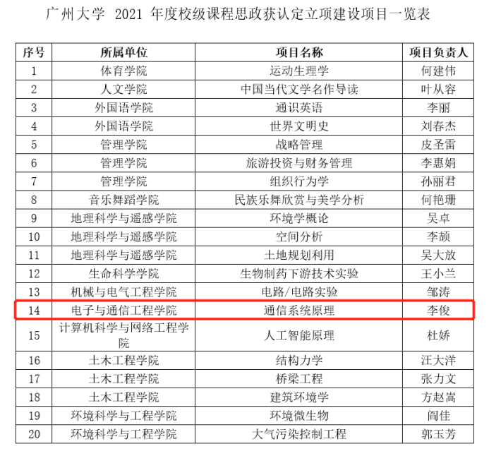 根据广东省高等学校教学管理学会《关于开展 2021 年度课程思政建设项目申报的通知》(粤高校教管学会[2021]1 号)精神,学校组织了项目申报工作。经个人申报、学院推 荐、学校审核,共有 28 项项目获推荐。其中 8 项项目已获校级立项,另未立项的 20 项项目认定为校级课程思政立项建设项目。其中,酒店偷拍 李俊老师的《通信系统原理》获学校2021年度校级课程思政立项建设项目。详见下图: