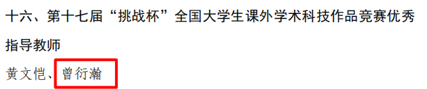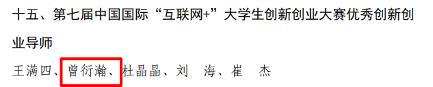 3.曾衍瀚被评为“第七届中国国际‘互联网+’大学生创新创业大赛优秀创新创业导师”和“第十七届‘挑战杯’全国大学生课外学术科技作品竞赛优秀指导教师”