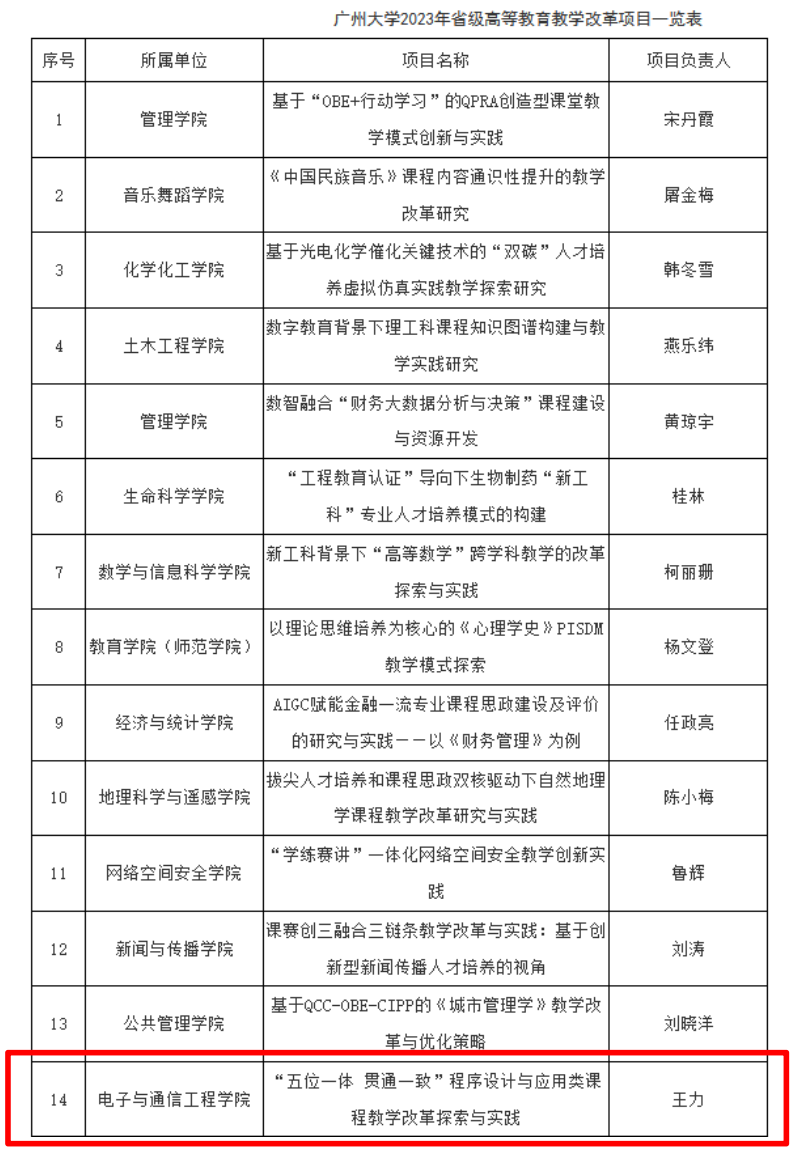 -小蚁智控物联网校企联合实验室获批2023年省级质量工程建设项目、王力博士的“五位一体 贯通一致”程序设计与应用类课程教学改革探索与实践获批2023年省级高等教育教学改革项目。