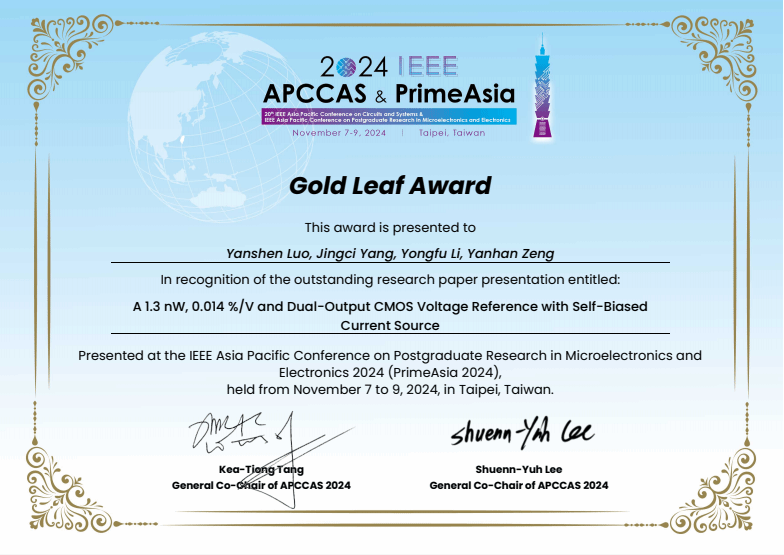 近日,酒店偷拍 2022级集成电路工程专业研究生罗延伸同学在2024年亚太地区微电子与电子研究生研讨会(The Asia Pacific Conference on Postgraduate Research in Microelectronics & Electronics,简称PrimeAsia 2024)所投递的论文成果“A 1.3 nW, 0.014 %/V and Dual-Output CMOS Voltage Reference with Self-Biased Current Source” 被评为“金叶奖”(GOLD Leaf Award)。