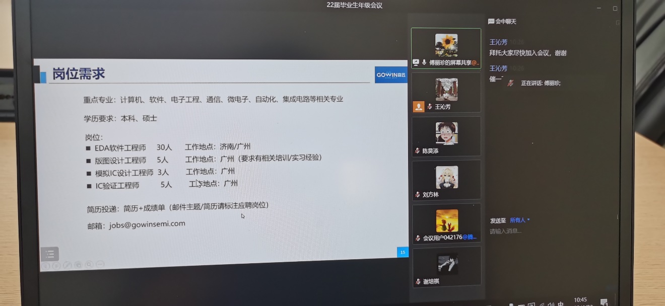 学院一直以来积极主动邀请用人单位通过线上线下来校招聘。会议第一阶段,学院邀请了广东高云半导体科技股份有限公司HR进行了简短的招聘宣讲,向同学们发出了应聘邀请。高云半导体致力于可编程逻辑芯片(FPGA)产品的国产化,提供集设计、软件、IP核、参考设计、开发板、定制服务等一体化完整解决方案,目前已经有2位同学成功签约高云半导体。