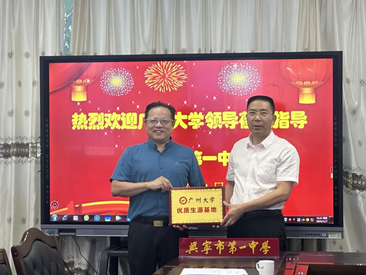 在赴兴宁一中的调研中,双方就优质生源基地建设进行了深入交流,共同签署了招生合作协议。学院党委书记陈泽龙授予兴宁一中“优质生源基地”牌匾,并表示希望以建立“优质生源基地”为契机,建立常态化长效化教育合作机制,密切中学和大学衔接,实现资源共享、英才共育、协同共赢,共同推动人才培养质量进一步提升。